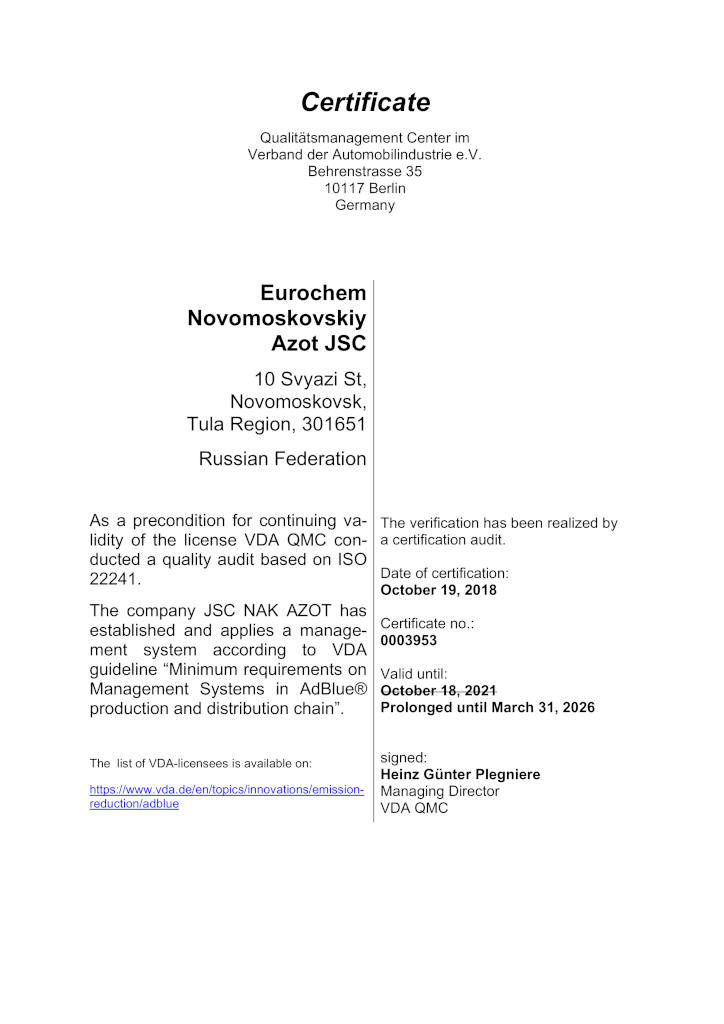 - Официальная лицензия от VDA на торговый знак AdBlue. (№ 0003953)